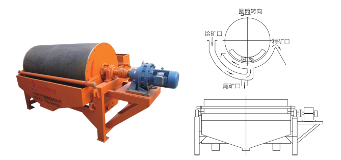 CTB型半逆流濕式精選機(jī)適用于濕式選別礦石粒度為0.5mm以下強(qiáng)磁性物料的掃選和精選,尤其適用于粒度為0.15~0mm礦物的精選。或者除去非磁性礦物中混雜的強(qiáng)磁性礦物。CTB型半逆流濕式精選機(jī)可以獲得高質(zhì)量的鐵精礦,同時也能有較好的回收率,所以半逆流精選機(jī)在生產(chǎn)實(shí)踐中被廣泛的應(yīng)用。本機(jī)可以連續(xù)給礦和排礦,磁場強(qiáng)度大,磁場梯度高,具有較高的處理能力。可以多臺串聯(lián)和并聯(lián),實(shí)現(xiàn)多次的掃選和精選。 其原理是當(dāng)?shù)V漿進(jìn)入磁場區(qū)時,其中強(qiáng)磁性礦物被吸附在圓筒表面,弱磁性和非磁性礦物被水流沖洗排出,而吸附在圓筒表面上的磁性礦物隨圓筒旋轉(zhuǎn),被帶出磁場區(qū),用沖洗水沖入精礦槽中,完成分選作業(yè)。二、示意圖