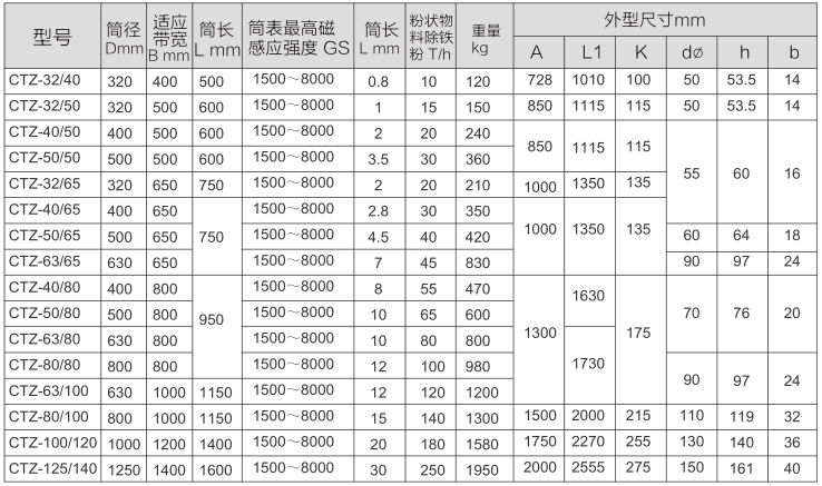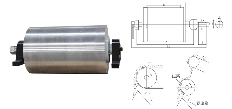 CTZ型中場強半磁滾筒(CTZ型中場強全磁滾筒結構與RCT型參數等同),多用于對粉狀、顆粒狀、小塊狀物料的凈化處理,或對鐵質的回收利用,對防止破碎機、研磨機、壓榨機的破壞和磨損起著可靠的保護作用。它安裝方便、吸力強、無能耗、連續工作、操作簡單。根據TD-75型帶式輸送標準設計,能滿足廣大用戶對高場強、大深度除鐵的使用要求。廣泛應用于冶金、陶瓷、磨料、磨具、金剛砂、非金屬礦、耐火材料、礦山、食品、化工、玻璃、建材等行業。二、示意圖