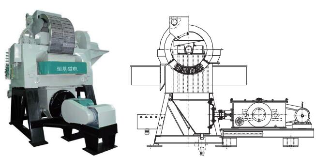 我公司HJLH型濕法立環高梯度磁分離機屬自主創新和研發,其技術創新的采用簡單易取的水作為冷卻介質,勵磁線圈采用大厚度的空心管導線,水流直接通過空芯管導線中間,線圈的熱量用較為直接的方式傳導至水,利用水流的快速循環,將熱量帶走。二、示意圖